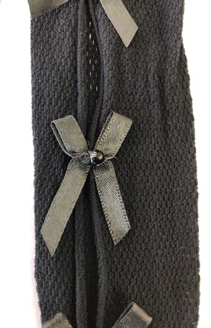 Fishnet pantyhose with cutouts along the front featuring satin bows with rhinestone centers, a thick elastic waistband and a back seam. G-string not included.