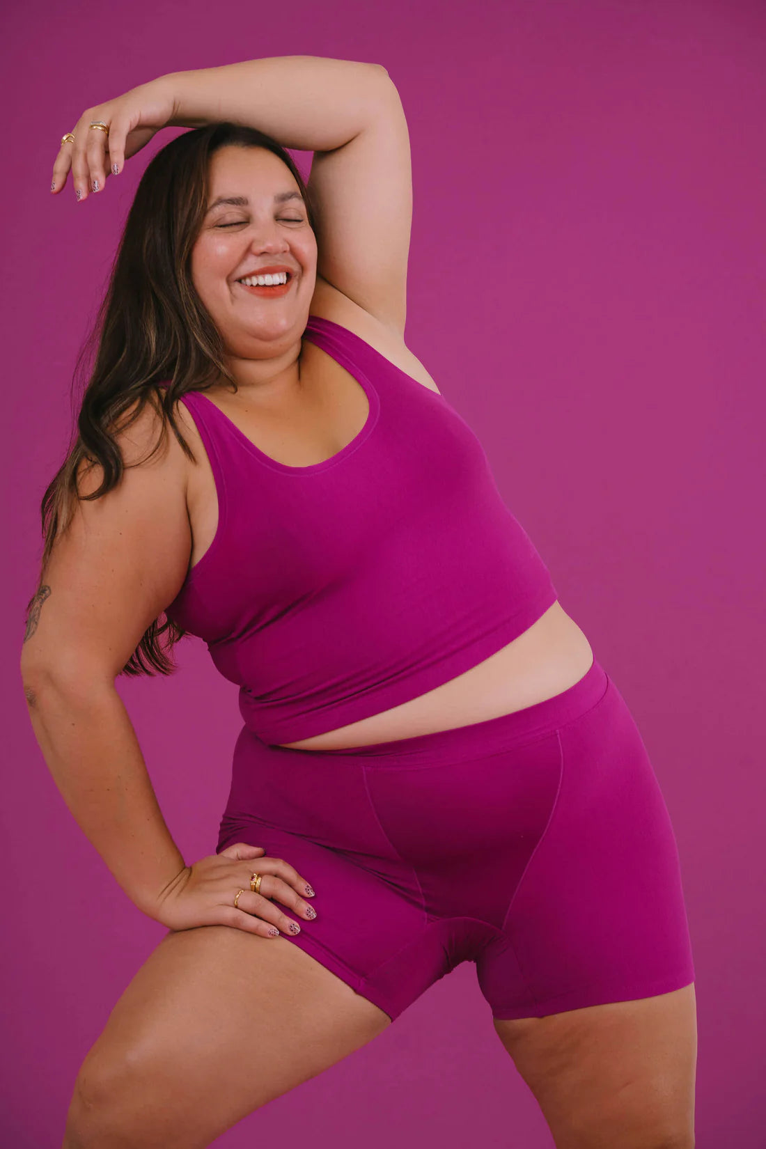 For those who value comfort with coverage. High-waisted and extending to the upper-mid thigh, the Mid Boxer is made for lounging, lunging, or anything in between. The soft, elasticated waistband and elastic-free leg cuffs hold their shape without digging into yours. Features a cute front panel for soft support.
